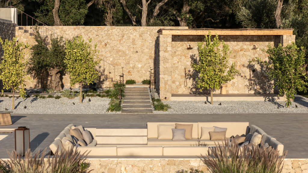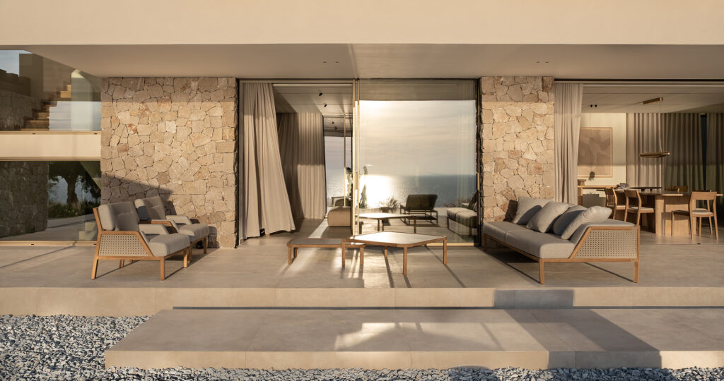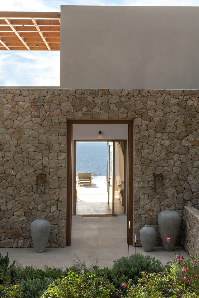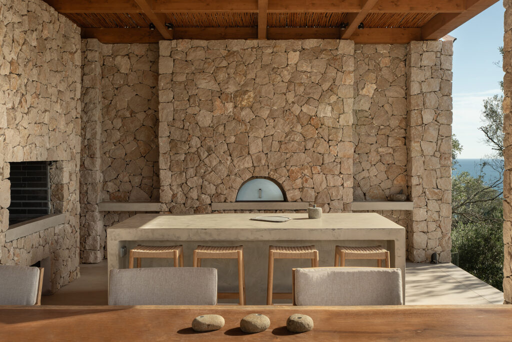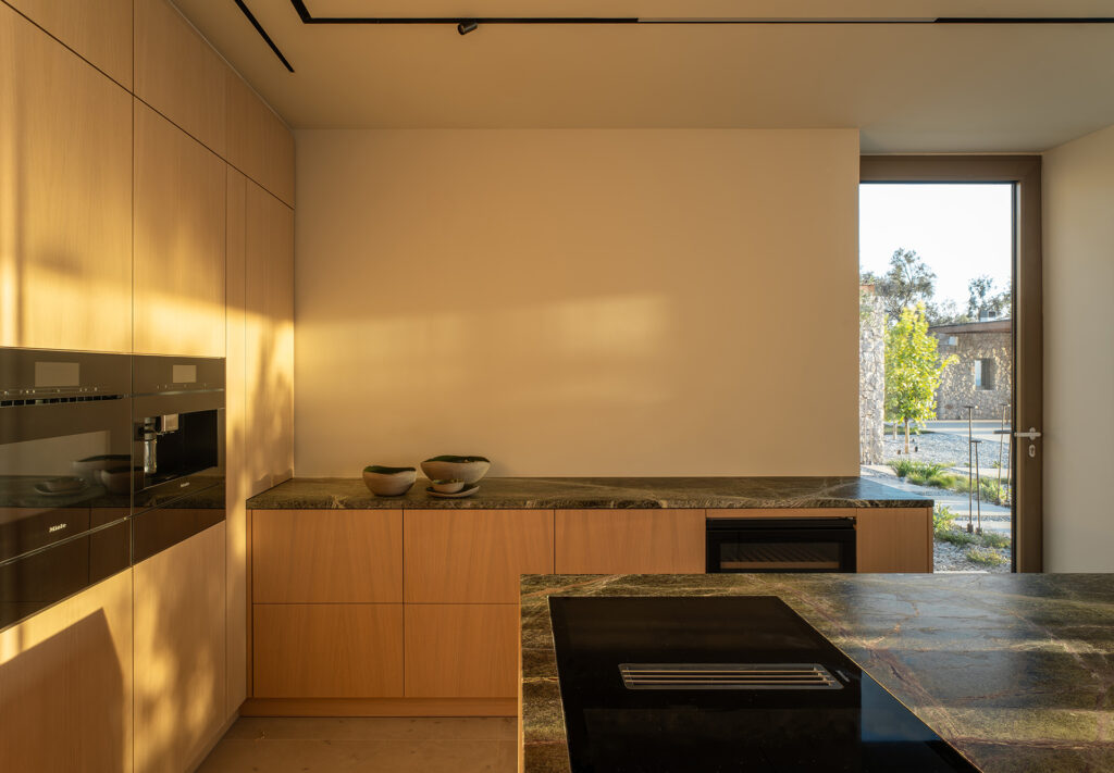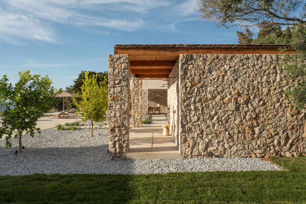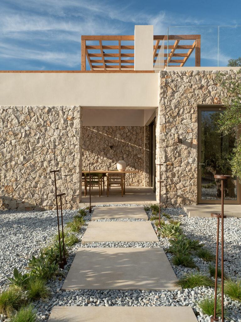 It's a contemporary design, with respect to the rural materiality and modern amenities. The warm tones of the stone, the roughness of natural pavings and earthy tones of the materials create a relaxing and soothing vibe in both the interior and exterior.