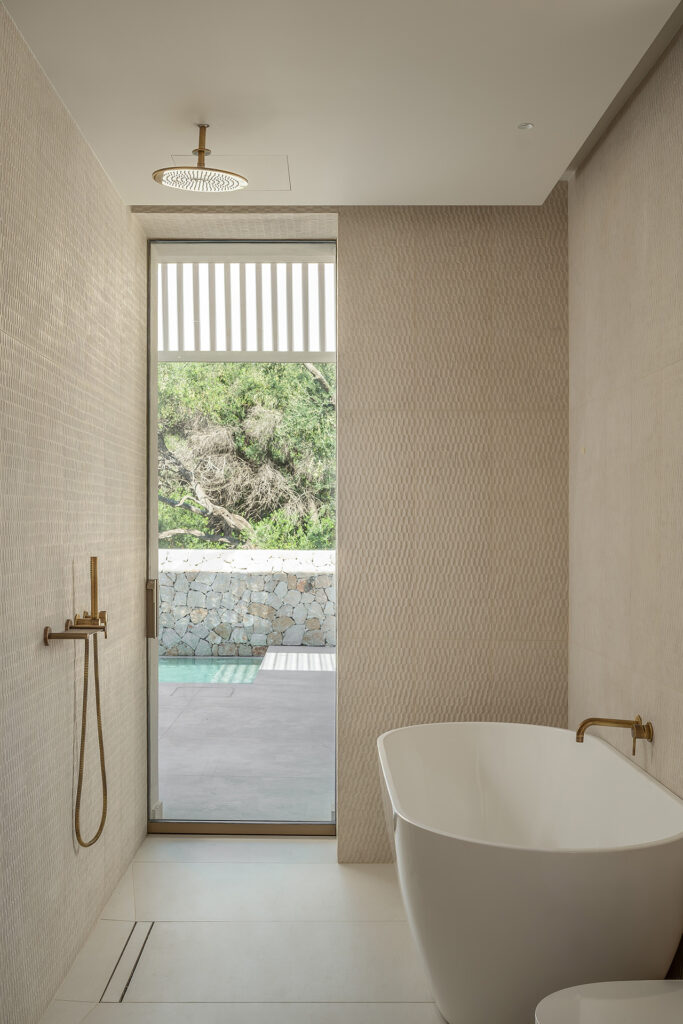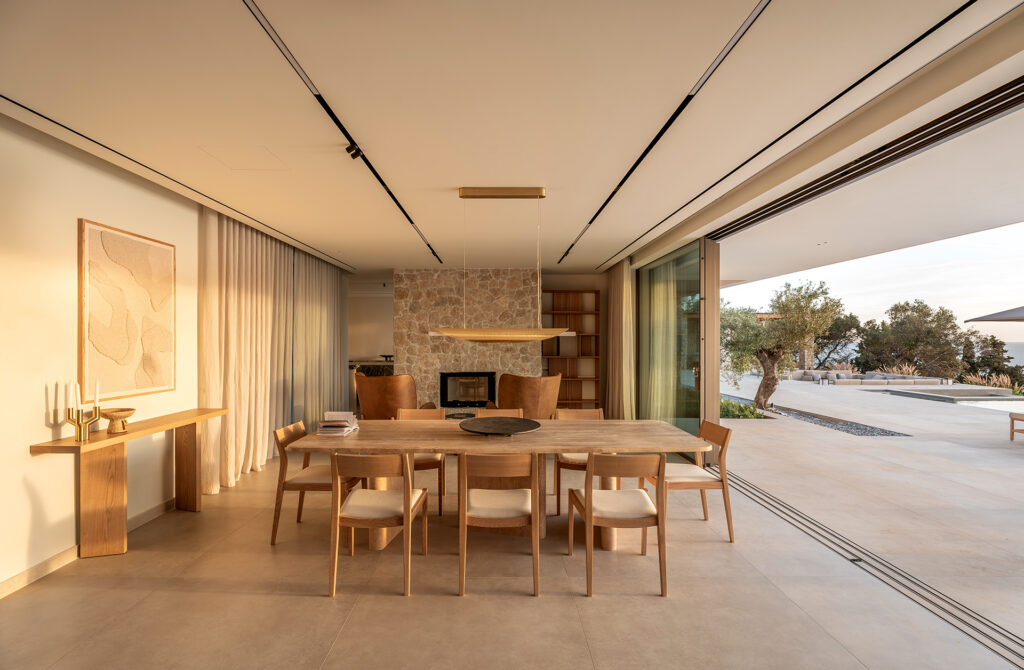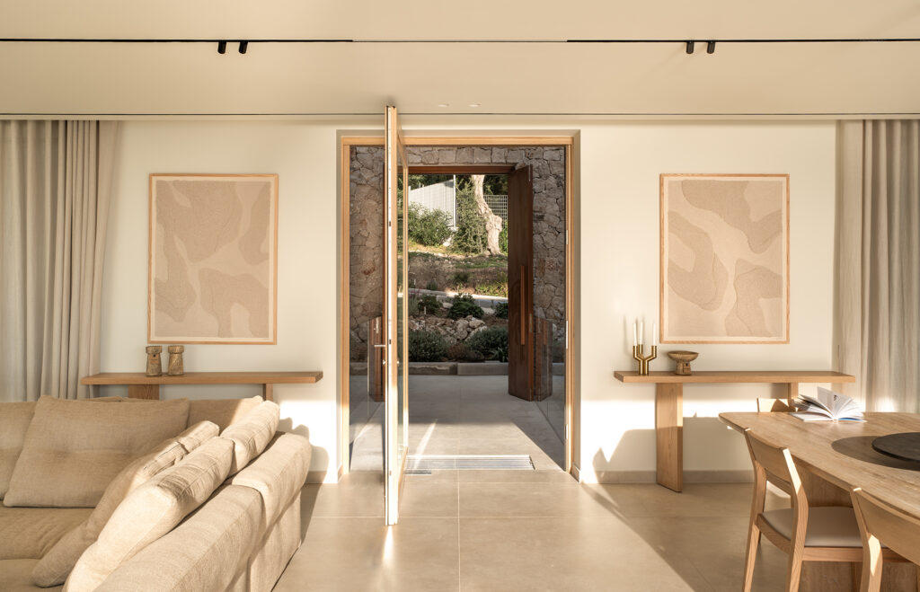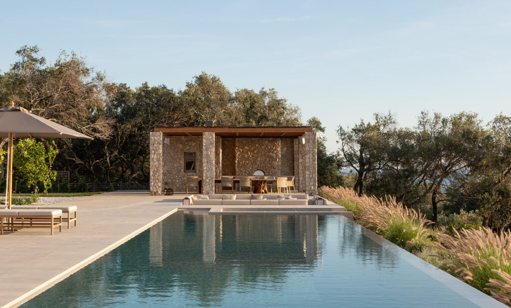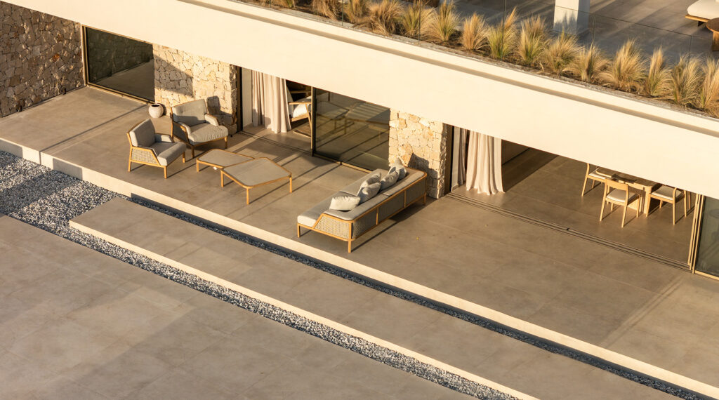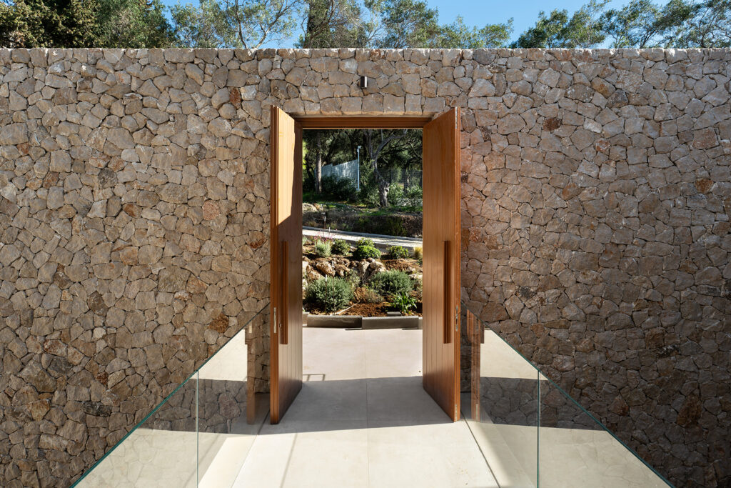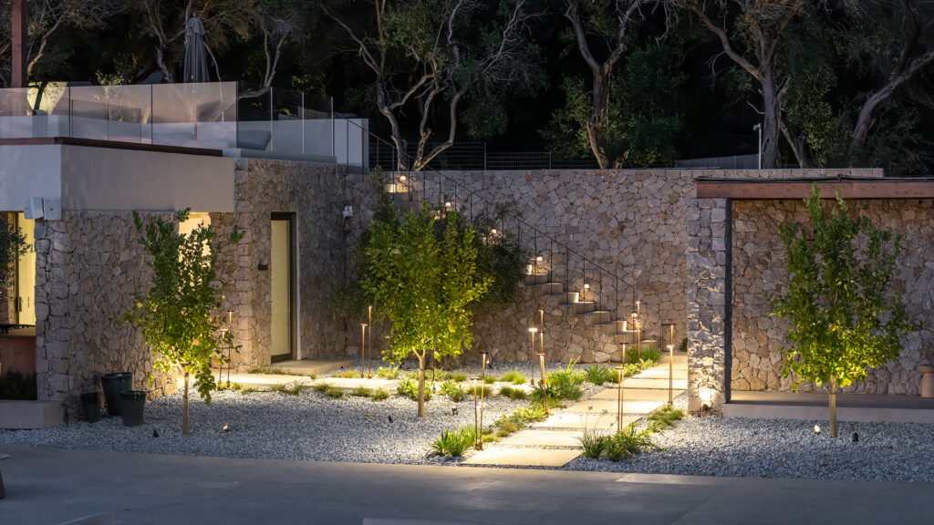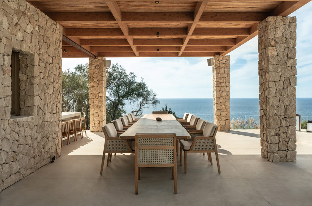 It's a contemporary design, with respect to the rural materiality and modern amenities. The warm tones of the stone, the roughness of natural pavings and earthy tones of the materials create a relaxing and soothing vibe in both the interior and exterior.