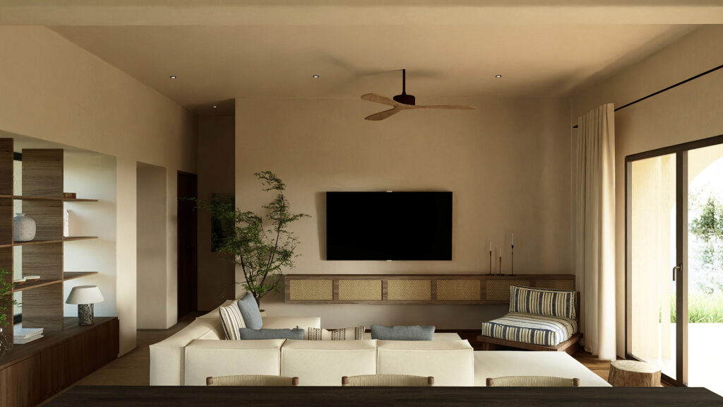 The interior and exterior are closely intertwined. Large openings frame the sea, allowing natural light and ventilation to flow through the main living areas, while a shaded veranda with arches extends the interior outward, creating a relaxed semi-outdoor living space. Transitional zones, from covered walkways to pergolas, guide movement through the house and encourage a constant relationship with the surrounding environment.