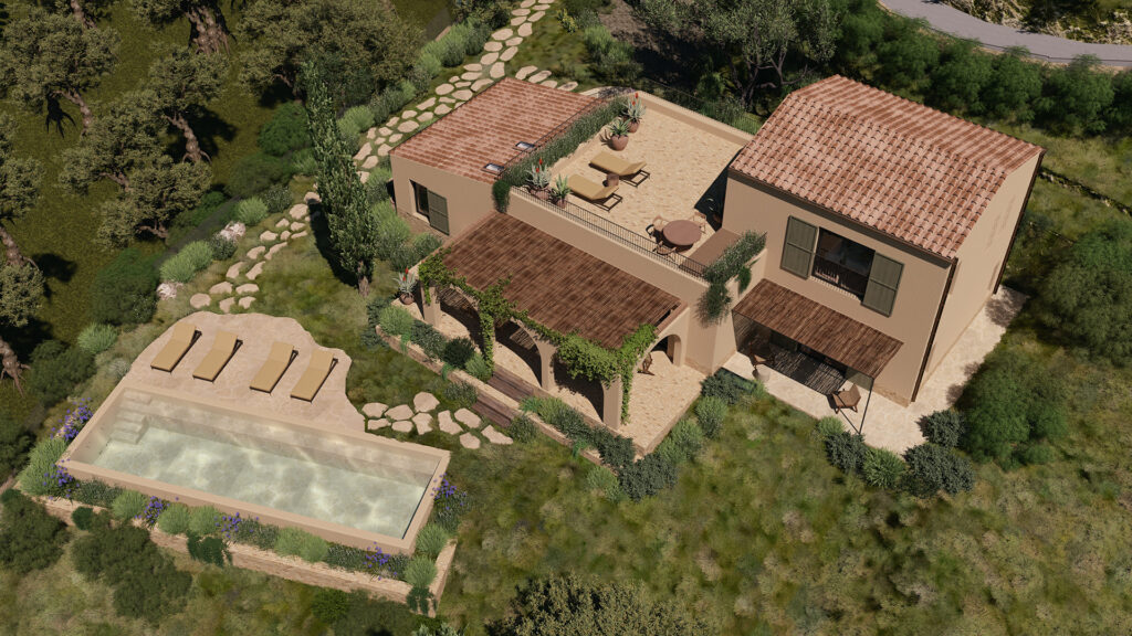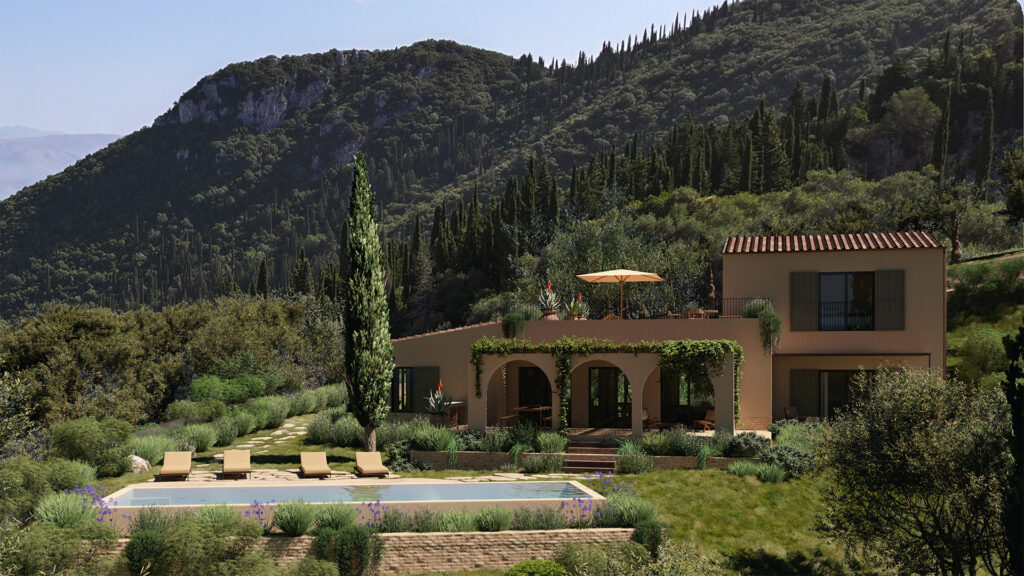 Natural materials define the palette: local stone, timber, plaster in earthy tones, and traditional Corfiot bricks and roof tiles create a sense of place while harmonizing with the surrounding landscape. Vegetation and pergolas soften the transitions between built form and nature, creating shaded, comfortable outdoor areas that encourage lingering and enjoyment of the views.