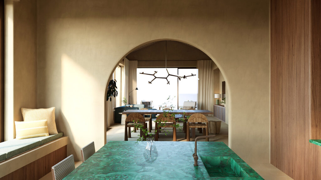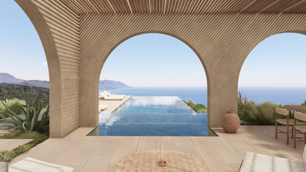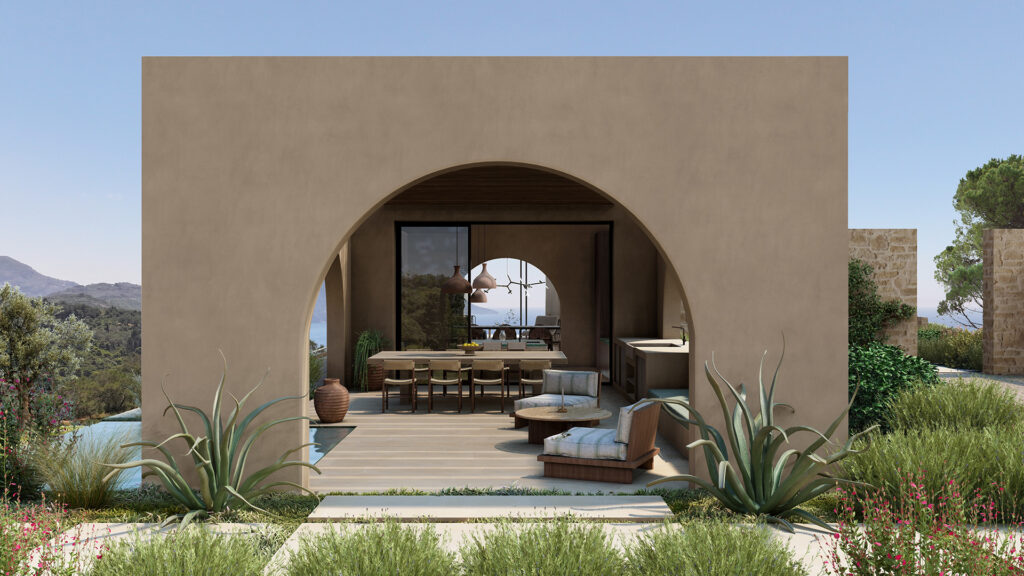 Roi is located on the island of Corfu, set within a gently sloping landscape overlooking the Ionian Sea. The design draws from the local architectural language, reinterpreting the traditional arch as a central element that mediates between interior and exterior while framing views toward the horizon.