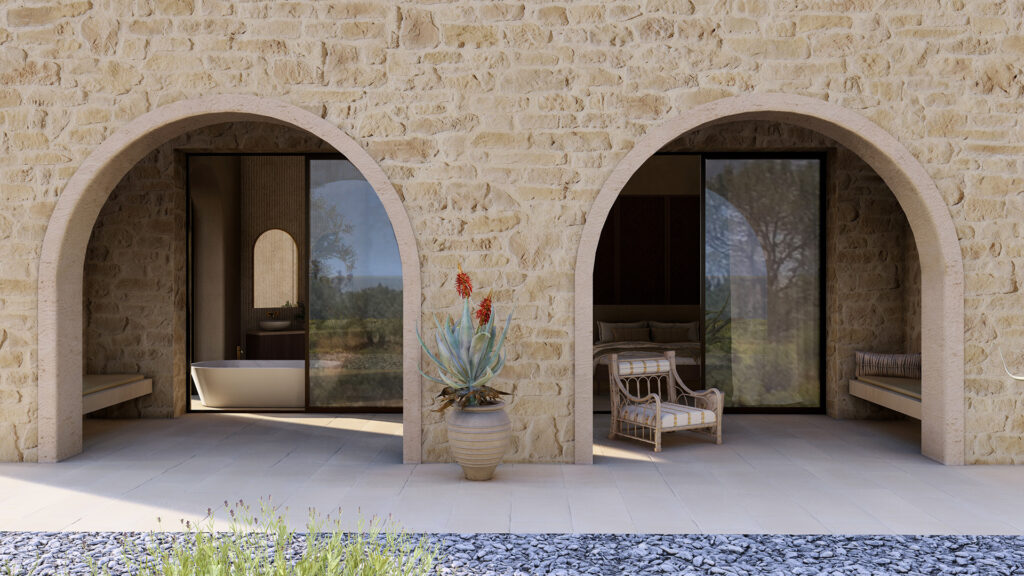 The house is carefully positioned across the natural slope, extending along the terrain with minimal intervention and preserving the site’s character. The ground floor is expressed as a solid stone volume, articulated by a sequence of arches that define the façade and create shaded semi-open spaces. Within this base, the bedrooms are arranged to ensure privacy while maintaining a close relationship with the surrounding landscape.