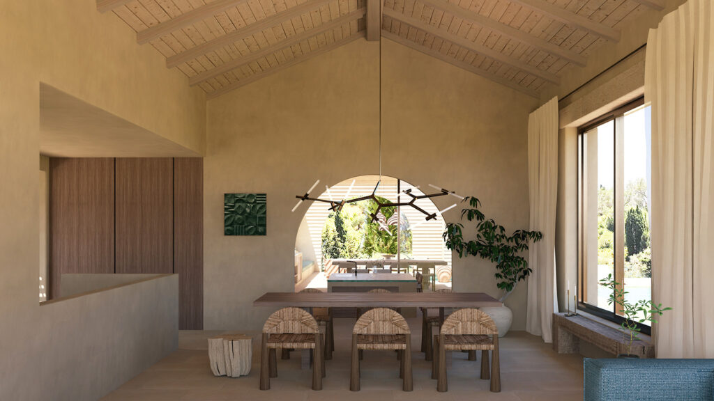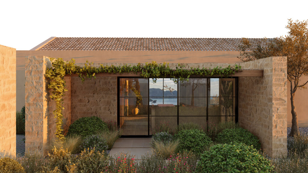 Natural stone, plastered surfaces in earthy tones, timber elements, and generous glazing define the material palette, ensuring a harmonious integration with the environment.