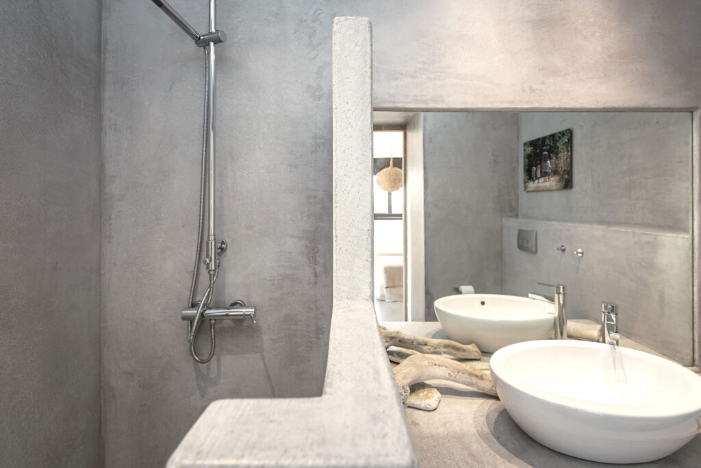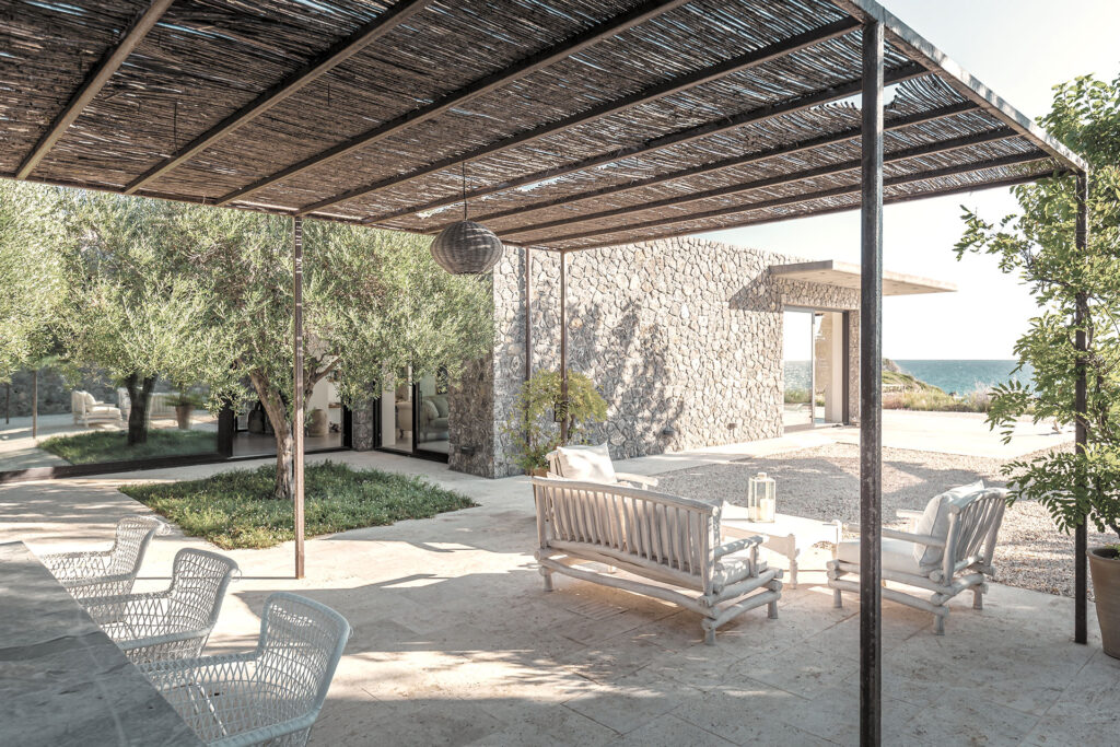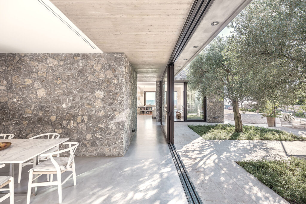 Due to its proximity from the sea, all the materials were chosen based on their humidity resistance properties. The multi-leveled structure was made from reinforced concrete, and the soil from the excavations of the basements was used to create the landscape on the property.